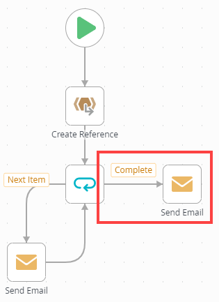 1. Next, you configure an email that lets you know the looping is complete. From the Toolbox > Basic node, drag a Send Email step onto the design canvas. Connect the Complete outcome to the new step.