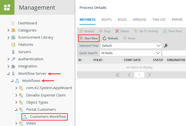 2. Expand the Workflow Server > Workflows node. Navigate to and select the Customers Workflow. (Your tree may not match the image below depending on your environment and where you created the custom list.) Click the Start New button located in the central pane.