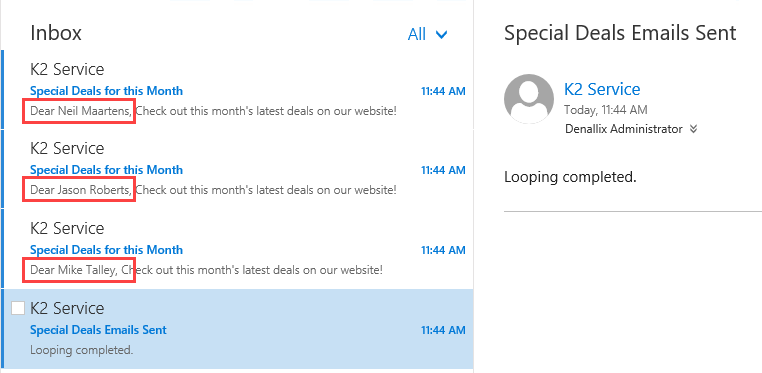 6. Test the looping process by starting a new instance of the Customers Workflow from K2 Management. Open your email client. You should see one email for each customer in your list, along with the final confirmation email.