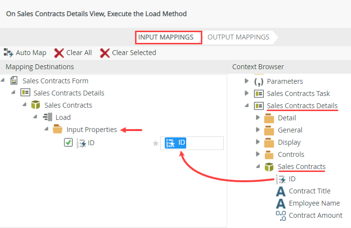 - On the Input Mappings tab, map the Sales Contracts Details (view) > Sales Contracts (SmartObject) > ID to the > Input Properties > ID text box. Click Finish to save the settings.