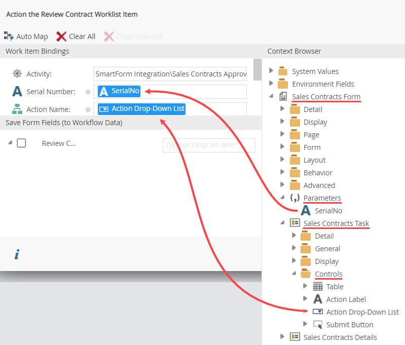 - Map the Parameters > SerialNo to the Serial Number text box. This links the form to the correct workflow instance. Map the Sales Contracts Task (view) > Controls > Action Drop-Down List to the Action Name text box. Here, you are mapping the user-selected value from the actions drop-down list control as the task decision, so that the workflow will follow the correct path. Finally, click OK.