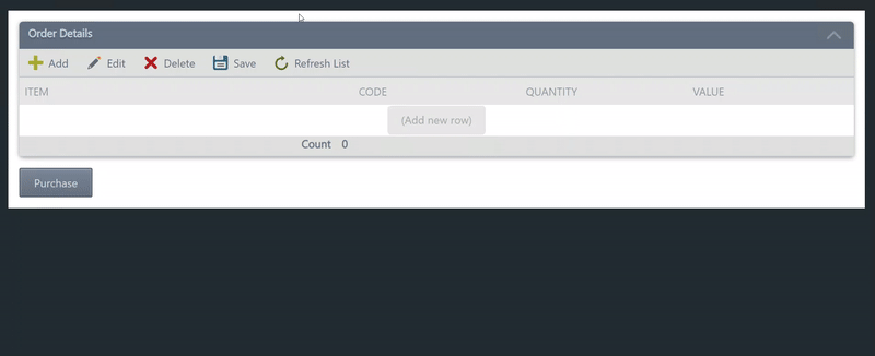 - On the Order Details view, add a new row and only enter information on the Code, Quantity and Value fields and click Save or click out of the newly added row.