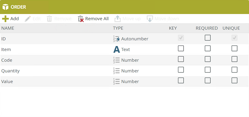 Properties Type Key Required Unique ID Autonumber Yes No Yes Item Text No No No Code Number No No No Quantity Number No No No Value Number No No No
