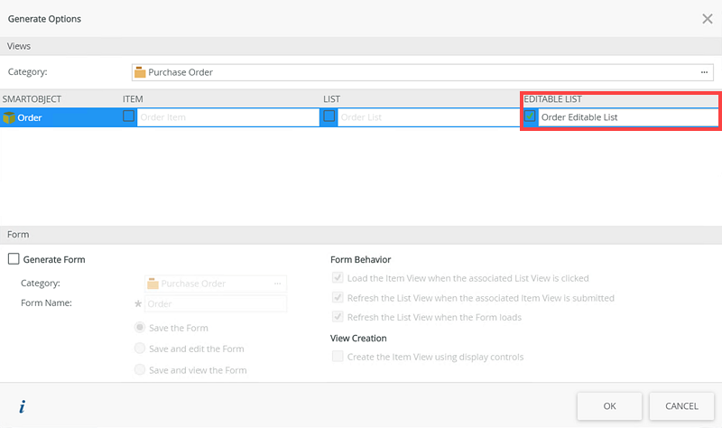 In the steps below, you create a SmartObject called Order. You generate an editable list view based on the Order SmartObject and create a form called Purchase Order. You then add the view to the Purchase Order form and configure view and form level rules to check if the required field is empty or a row is blank.
