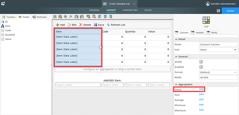 - Select the Item column and click Count in the Aggregation section. The purpose of the Count is to count how many rows are in the Order view. Later in this how-to, you will use the count option in a rule; if the count is 0, a message will display.