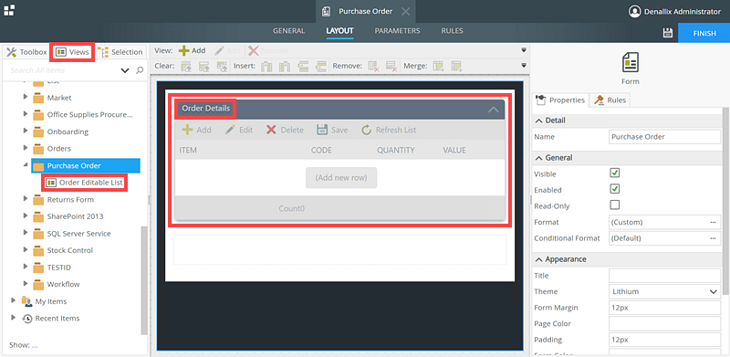 In this step you configure the rules for the Order Details view and the Purchase Order form.