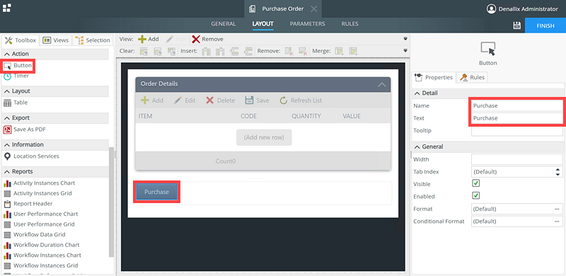 - Add a Button control to the Purchase Order form and rename it to Purchase.
