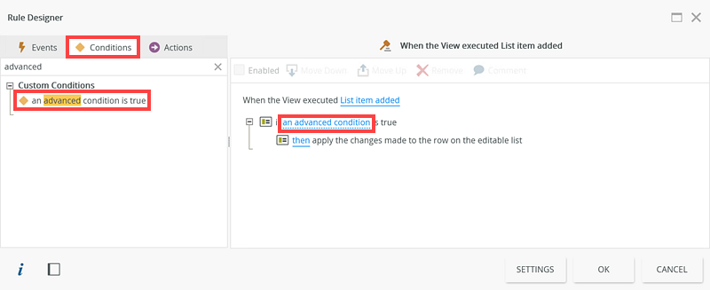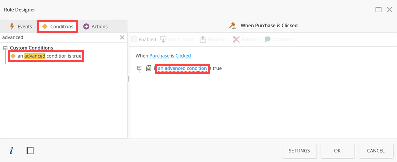 - On the Rule Designer page, select the Conditions tab and add the an advanced condition is true condition. Click an advanced condition to configure it.