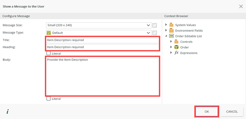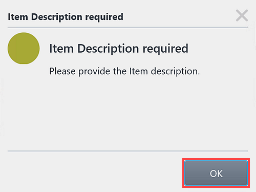 - Notice the Item Description Required message displays because the Item field on the Order Details view is empty. Click OK.
