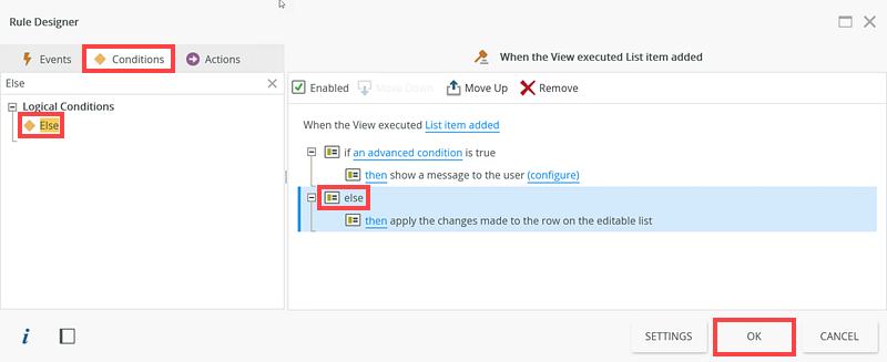 - Select the Conditions tab and add an Else condition to the rule as shown below. Click OK.