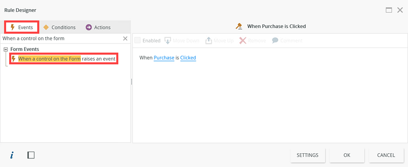 - On the Rule Designer page select the Events tab and add the When a control on the Form raises an event event.