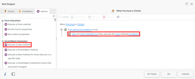 - On the Rule Designer page select the Actions tab, add another Execute a View method rule and click select View. Select the Order Editable List view and click select Method. Select the Save method and click configure.