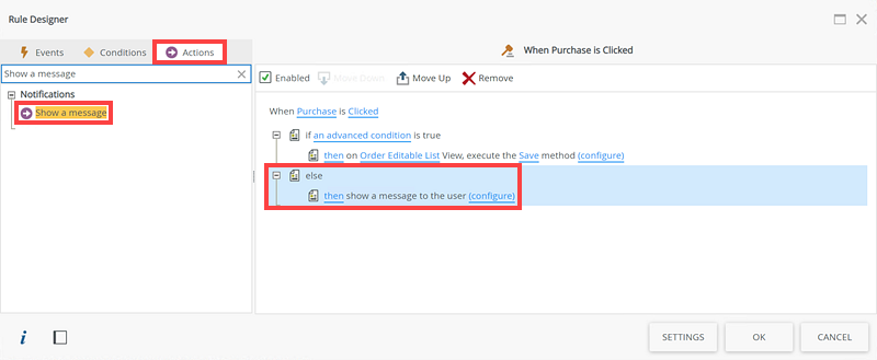 - On the Rule Designer page select the Conditions and add the Else condition. Select the Actions tab and add a Show a message action and click configure.