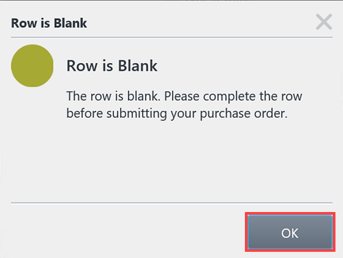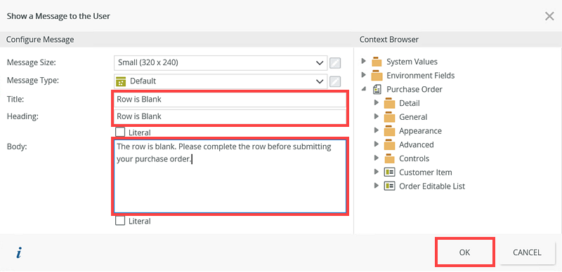 - On the Show a Message to the User page, add Row is Blank to the Title and Heading fields and add The row is blank. Please complete the row before submitting your purchase order. in the Body field. Click OK.