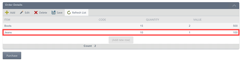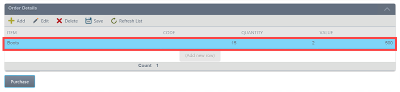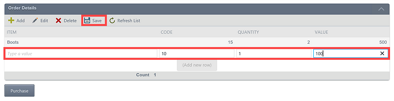 - Complete the newly added row and click Save then Purchase. Notice the row is saved because the Count aggregate is greater than 0.