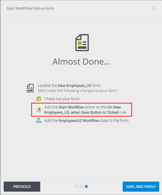- Keep the default selection of Specify how the workflow gets started > When a SmartForm is submitted > Form: New Employees_US