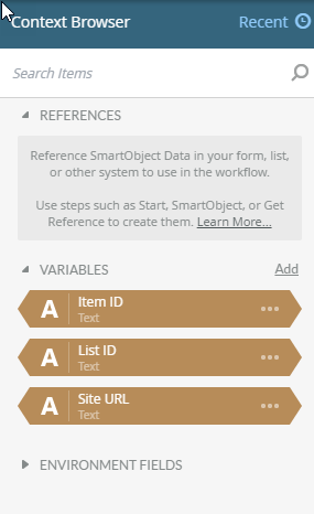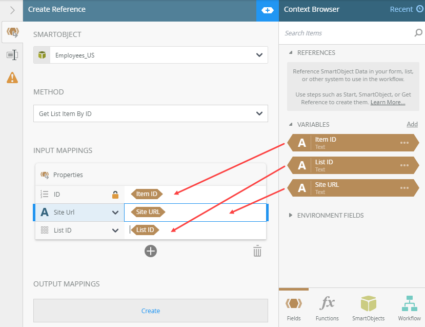 - Drag the Item ID, List ID, and Site URL variables from the context browser into the matching input mappings