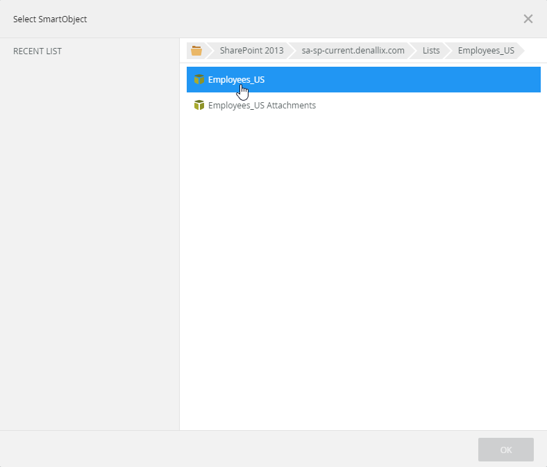- Click the SmartObject drop down and navigate to your SharePoint folder and select Employees_US