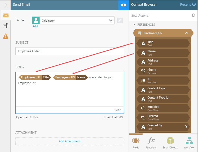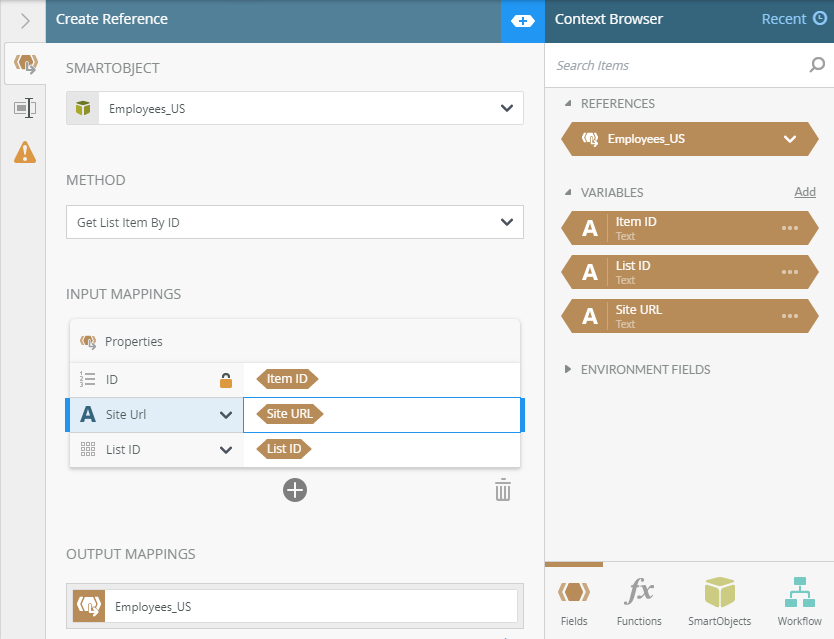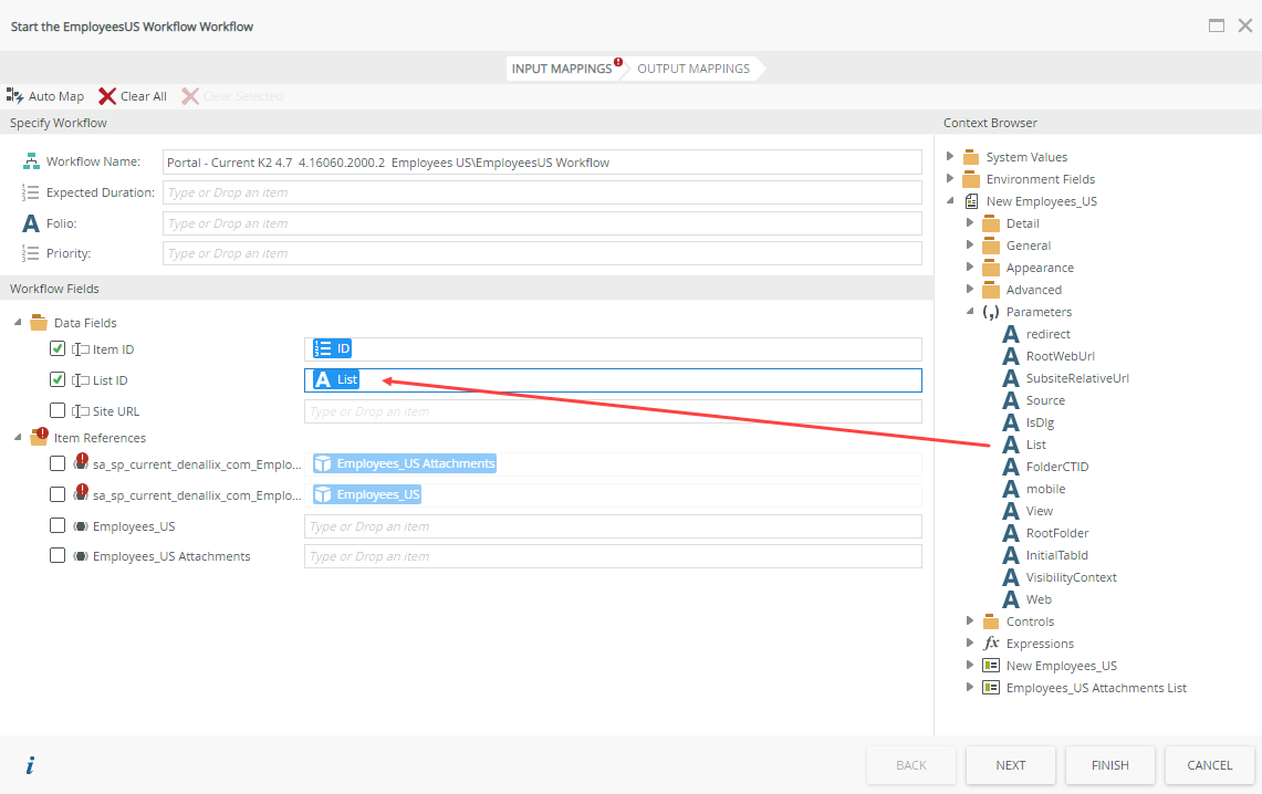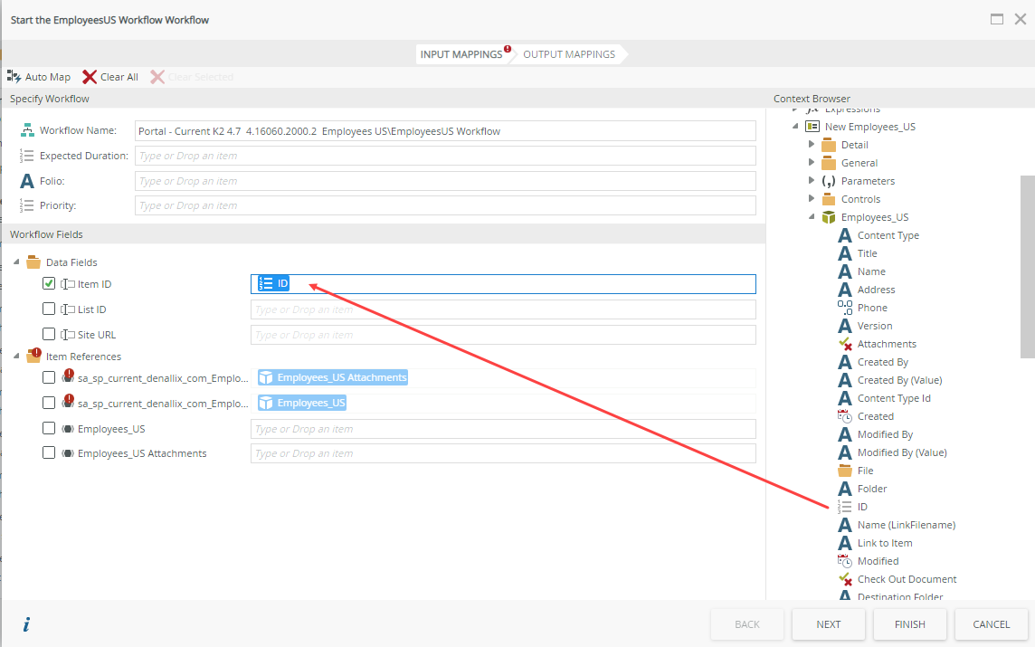 - Drag the ID field from the Employees_US SmartObject in the context browser to the Item ID workflow data field