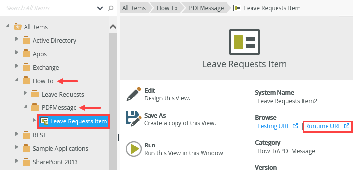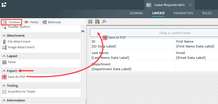 - Edit the Leave Requests Item view. On the left side of your screen, click the Toolbox tab. Locate the Export heading, then drag the Save As PDF control onto the design canvas at the top of the view.