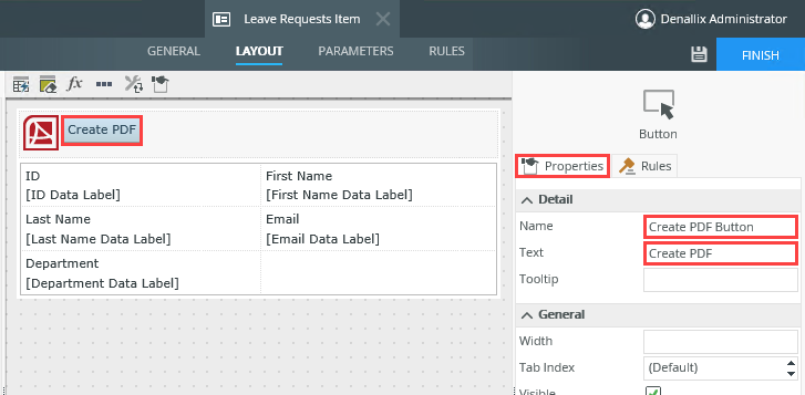 - Edit the Leave Requests Item view and add the Save As PDF control to the top of the design canvas. Add a Button control (to the right of the PDF control) and change the Name to Create PDF Button. Change the Text to Create PDF. Add and configure a rule using the table below as a guide.