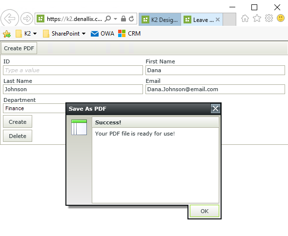 - Complete the view fields, with the exception of ID. (The ID is an autonumber that K2 adds when creating a record in the SmartObject.) Click Create PDF. You see the confirmation message (that appears after K2 creates the PDF file). Click OK. Notice the view fields clear, allowing you to input new details.