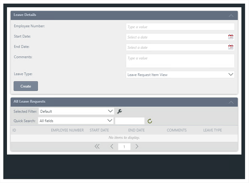 Create a form called Leave Request Form containing two views called Leave Request Item View and Leave Request List View. The views use the Leave Request SmartObject as the data source.
