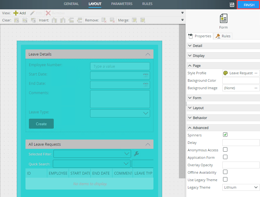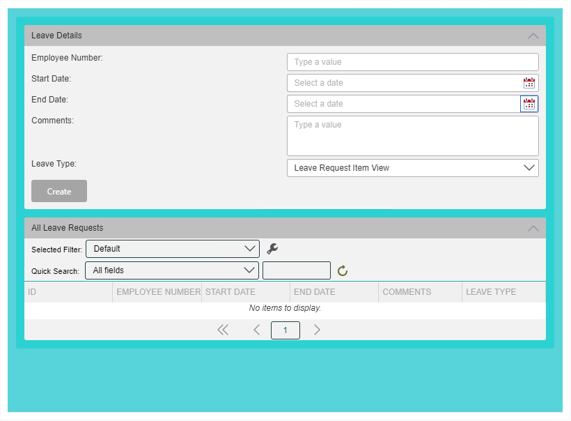 - Create the Leave Request Form. See How To: Create a Form for information about creating the form.