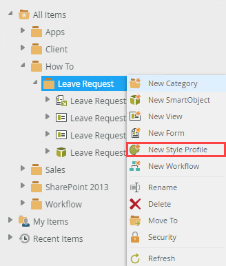 - From the K2 Designer, right-click the How To/Leave Request category and select New Style Profile.