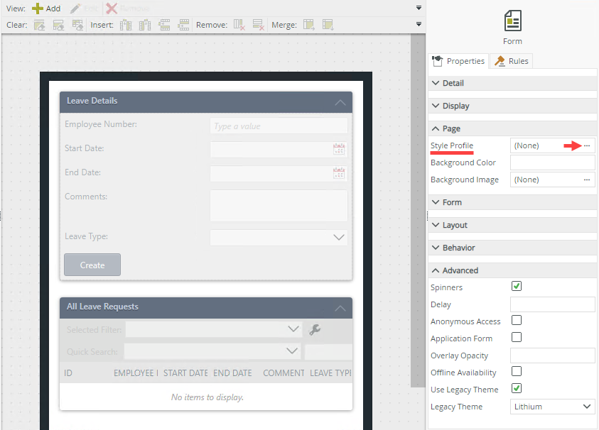 In this scenario, you create a form containing two views. You create a basic style profile and change the main colors. You then edit the Leave Request Form and apply the style profile to the form. Finally, you test the form to see the difference in style.