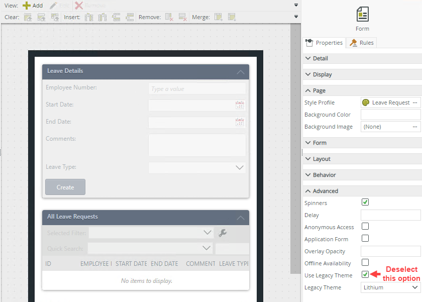 - In the Advanced section, deselect the option Use Legacy Theme. This property is applicable to legacy themes. To apply the style profile to your form, you must deselect this option.