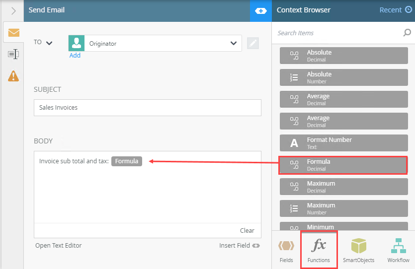 2. Select the Email step and modify the Subject and Body as shown below. Expand the Context Browser, click Functions, expand the Mathematics functions and drag and drop a Formula function to the email body.