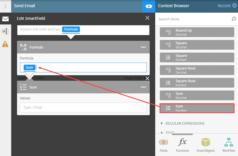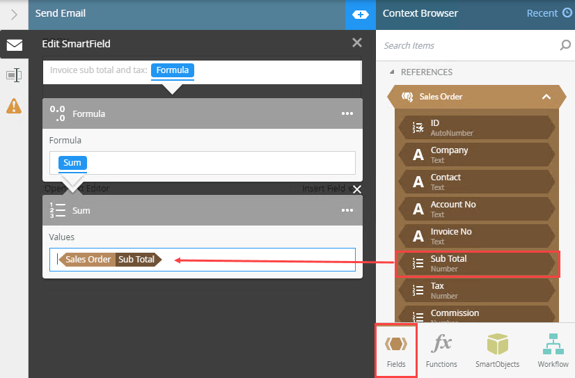 5. Select the Fields tab in the Context Browser and then expand the Sales Order reference. Drag and drop the Sub Total field into the Values field in the Sum function. (The reference comes from the Get List SmartObject step, and will return the values of each invoice's Sub Total to the Sum function.)