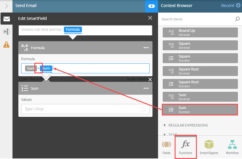 4. Select the Functions tab in the Context Browser, expand the Mathematical functions and scroll down to Sum (Number). Drag the Sum function to the body of the email.