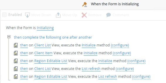 In this example, you have a form containing Client and Region tabs. The Client tab contains a Client Item view and Client List view, and the Region tab contains a Region Editable List view. When you generate a form using multiple views, K2 automatically creates a default rule called When the Form is Initializing, which executes the Initialize and List refresh methods for all views when the form opens. The image below shows the default Initializing rule for this example.