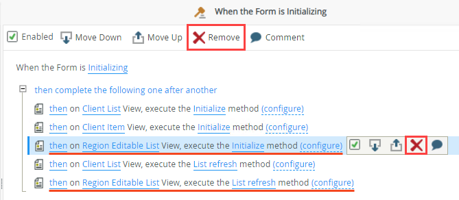 - Edit the When the Form is Initializing rule, select then on Region Editable List View, execute the Initialize method and click Remove or the click the Remove icon as shown below. Do the same for the then on Region Editable List View, execute the List refresh method action and then click OK to save the rule.