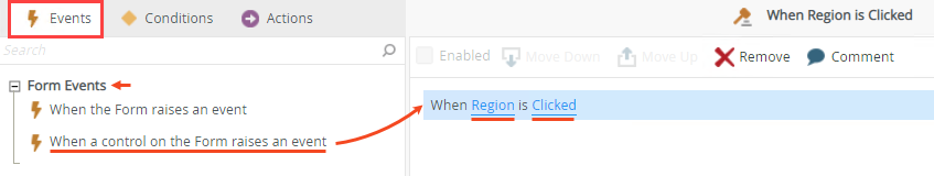 - In the Events tab, click the When a control on the Form raises an event event in the Form Events section, and then select the Region as the control and Clicked as the event as shown below.