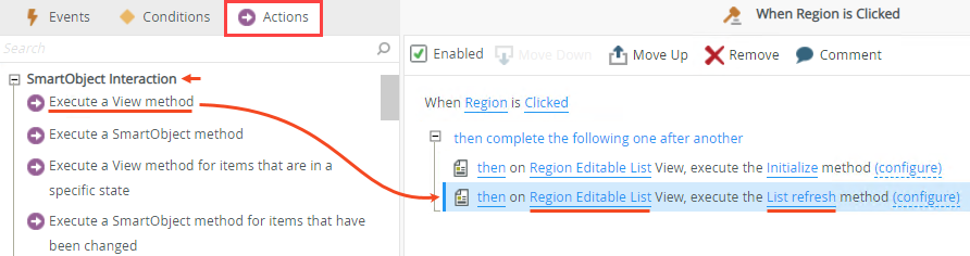 - Add the Initialize method that you removed from the default form Initialize rule. Go to the Actions tab, click the Execute a View method action in the SmartObject Interaction section, and then select the Region Editable List as the view and Initialize as the method as shown below.