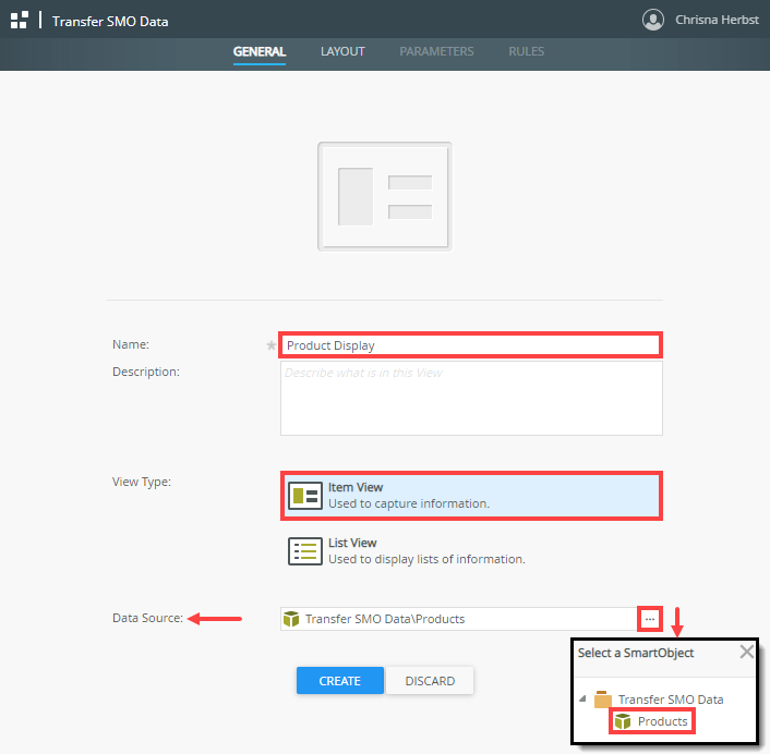 - In this step, you add two views for this demonstration. You use the first view to enter sample data into the Products SmartObject. From the Products SmartObject, designCreate an item view called Product Entry. Display all the fields except ID. Add a Create standard button. After you save the view, enter at least three sample product records. Be sure to upload images for each record.