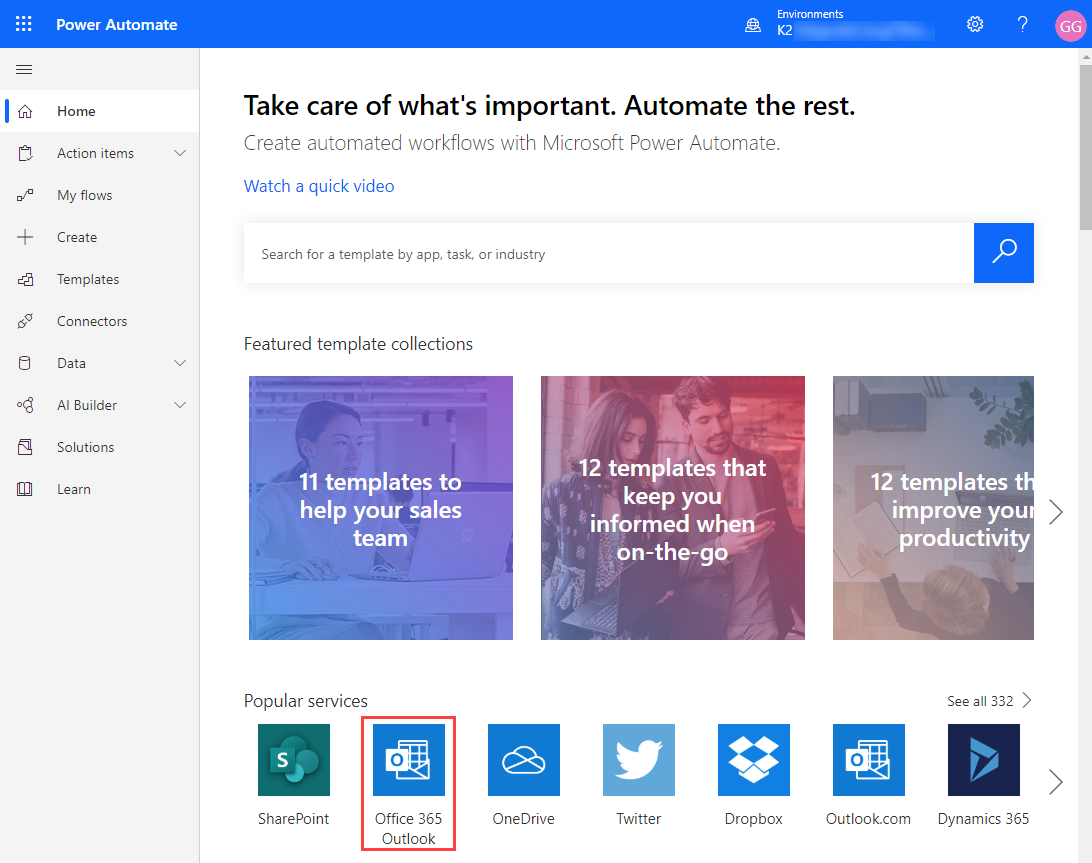 - In Microsoft Power Automate, click Home and select the Office 365 Outlook popular service.