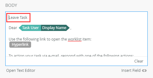 - Modify the notification Body by adding Leave Task to the top of the email. In the next step you create a Microsoft Outlook email rule to move task notifications to your Leave Tasks folder based on this phrase.