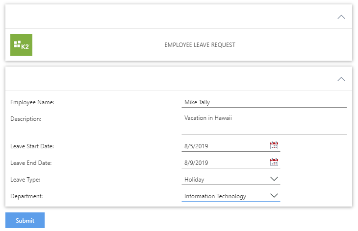 In K2 Designer create the Leave Request Application as described in How To: Getting Started.