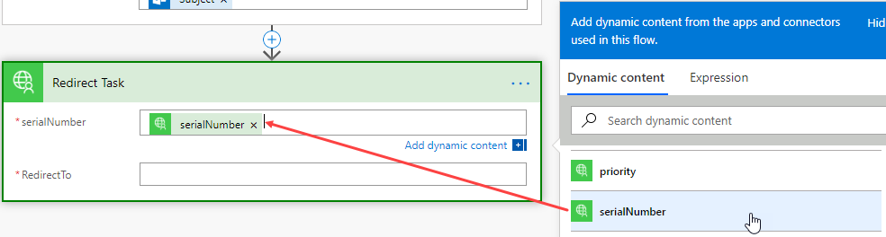 - Select the serialNumber text box and scroll down and click the serialNumber field from the Dynamic content tab.