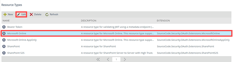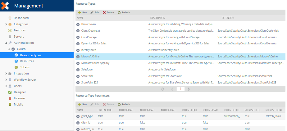 Field Description Name Provide a unique name for the OAuth Resource Type. The Name is usually the name of the service you wish to connect to (e.g. SalesForce or LinkedIn) since the parameters are usually specific to that service Description Provide a description for the OAuth Resource Type. Extension Extensions are used to handle any scenarios that are not covered by the OAuth2 specification. SharePoint, for example, uses a Server to Server token in on-premises installations that is not part of the OAuth2 specification. Refresh Token Expiration Days Indicates the number of days before the refresh token will expire. This varies from Resource to Resource and may not be applicable if the system supports rolling refreshes.