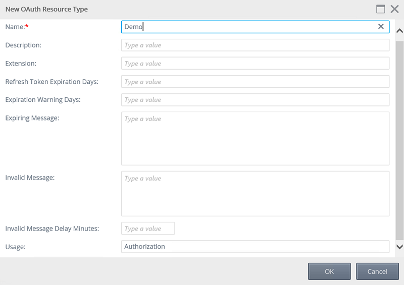 Expiration Warning Days The number of days before the token expires to send the warning message to the administrator of the expiring token. Expiring Message The message to send to the administrator when the token is going to expire. Invalid Message The message to send to the administrator when the token has expired or has failed for another reason. Invalid Message Delay Minutes A time value (in minutes) to delay the Invalid Message that is sent to the administrator if the token is invalid. Usage Default value of Authorization. If a Resource is based upon a type that has a Usage='Validation', then a Metadata Endpoint value is required in the OAuth Resource. - Click OK. The new Resource Type will display in the Resource Types view.