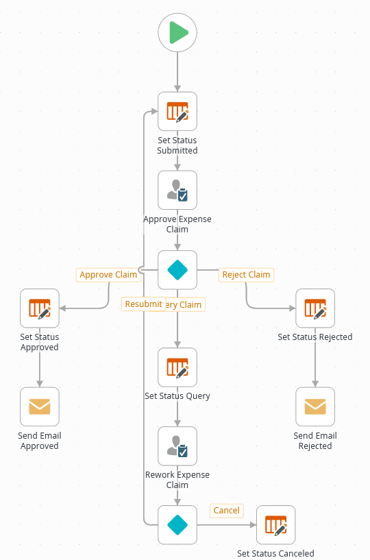 - Next, connect the Resubmit outcome to the Set Status Submitted step. This starts the entire approval process over again. It creates a looping effect between the approval and rework task steps. This loop can repeat itself over and over, until the claim is either approved, rejected, or canceled.