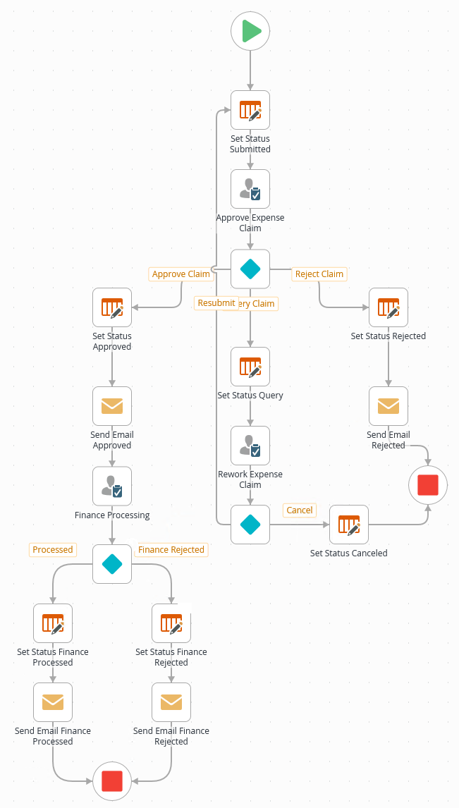 - Repeat the two steps above for the Processed outcome. Set the Status to Finance Processed, then rename the step Set Status Finance Processed. Edit the Send Email step to inform the originator of the finance processor's processed decision. Name the step Email Originator Finance Processed.