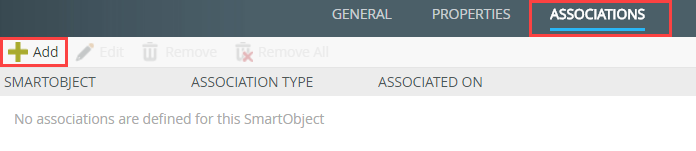 - Click the ASSOCIATIONS tab in the toolbar. You will associate the Expense Claim Line Item (Smartbox) SmartObject with the Expense Claim SmartObject (generated from the SharePoint Expense Claim list). Click the Add button.