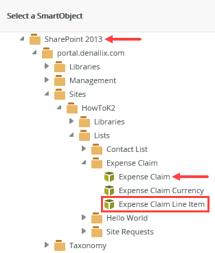 | Data Source | Use the browse icon to select the Expense Claim Line Item SmartObject. | This is the SmartBox SmartObject that you created to store the expense claim line items. (Your tree structure may not match the image exactly depending on your site and subsite names.) |