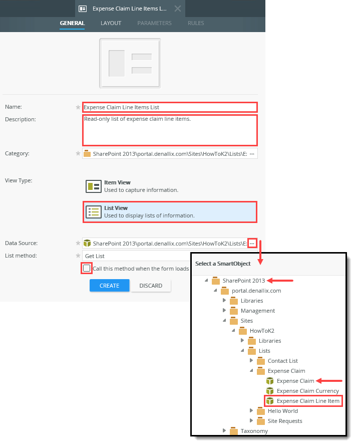 | Call this method when the form loads | NOT checked | You do not want the list view to populate automatically whenever it opens. You will configure a rule that populates the list view with the requester’s expense claim items. If you didn't do this, all of the expense claim items (in the SmartObject) are returned, regardless of the requester. |
